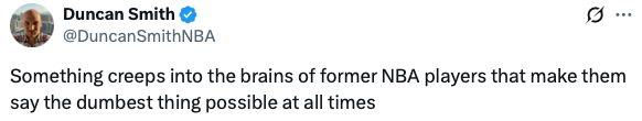 Duncan Smith说:“前NBA球员的大脑里潜伏着某种东西,让他们总是说出最愚蠢的话。”