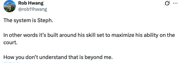 Rob Hwang说:“勇士的体系就是库里,换句话说,换句话说,整个战术体系都是围绕他的技术特点打造的,只为最大化他在场上的统治力。我真不明白这有什么难理解的。”