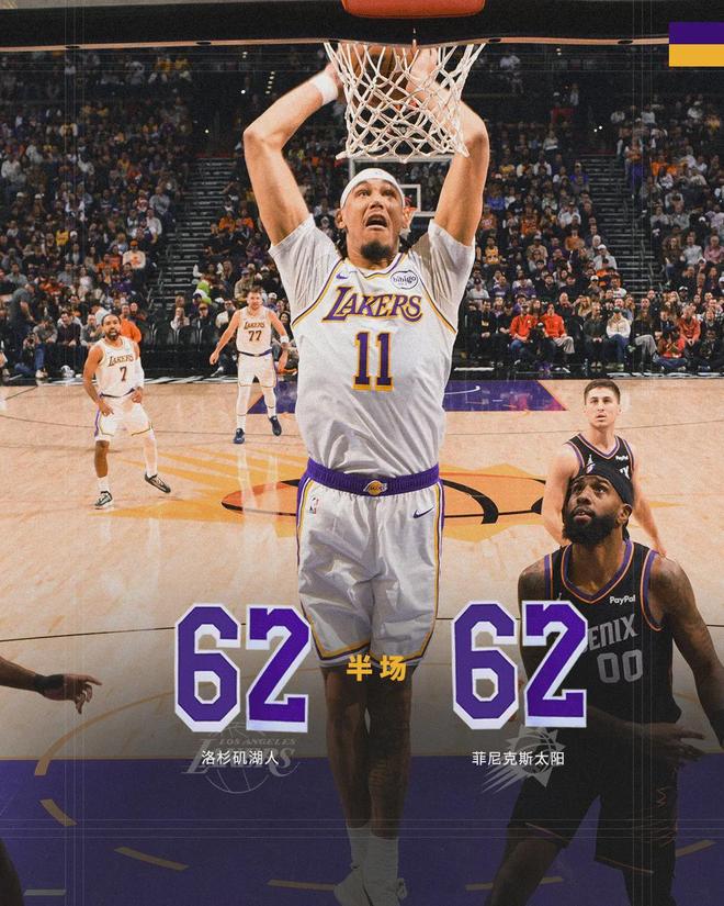 半场战罢,两队62-62打平了。东契奇12中5拿到17分1板3助5失误;詹姆斯7中4拿到15分1板1助1断1帽6失误。艾顿6中6砍下12分5板,成为湖人最稳定的进攻点。布克和马威上半场各砍10分,罗伊斯-奥尼尔三分7中4得到12分。
