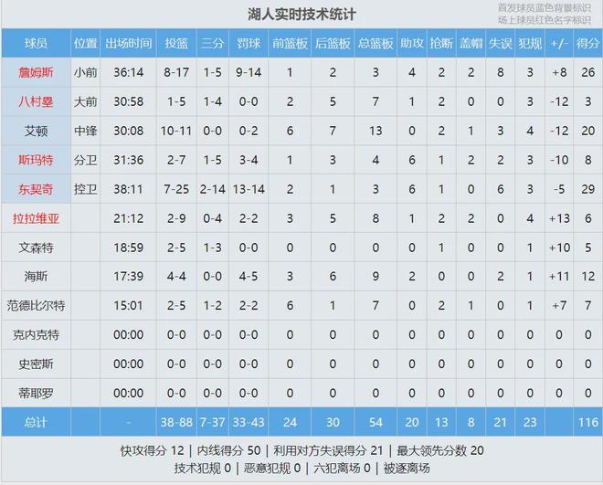 全场结束,湖人116-114险胜太阳,湖人罚球绝杀。东契奇29分3板6助、詹姆斯26分3板4助2断2帽、艾顿20分13板2断。布克27分6板7助、马威20分6板3帽、狄龙18分。最后看看数据,说说你的心情: